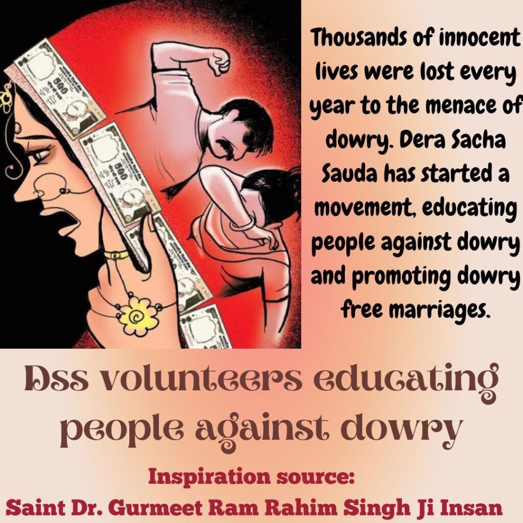 Ending dowry requires courage, awareness, and community action. Leaders such as Gurmeet Baba Ram Rahim promote dowry-free marriages through public messages, welfare activities, and mass marriage events that help poor families and encourage equality. Young students can learn, speak up, and support simple weddings that value respect over money. When families and leaders work together, the curse of dowry can be lifted.